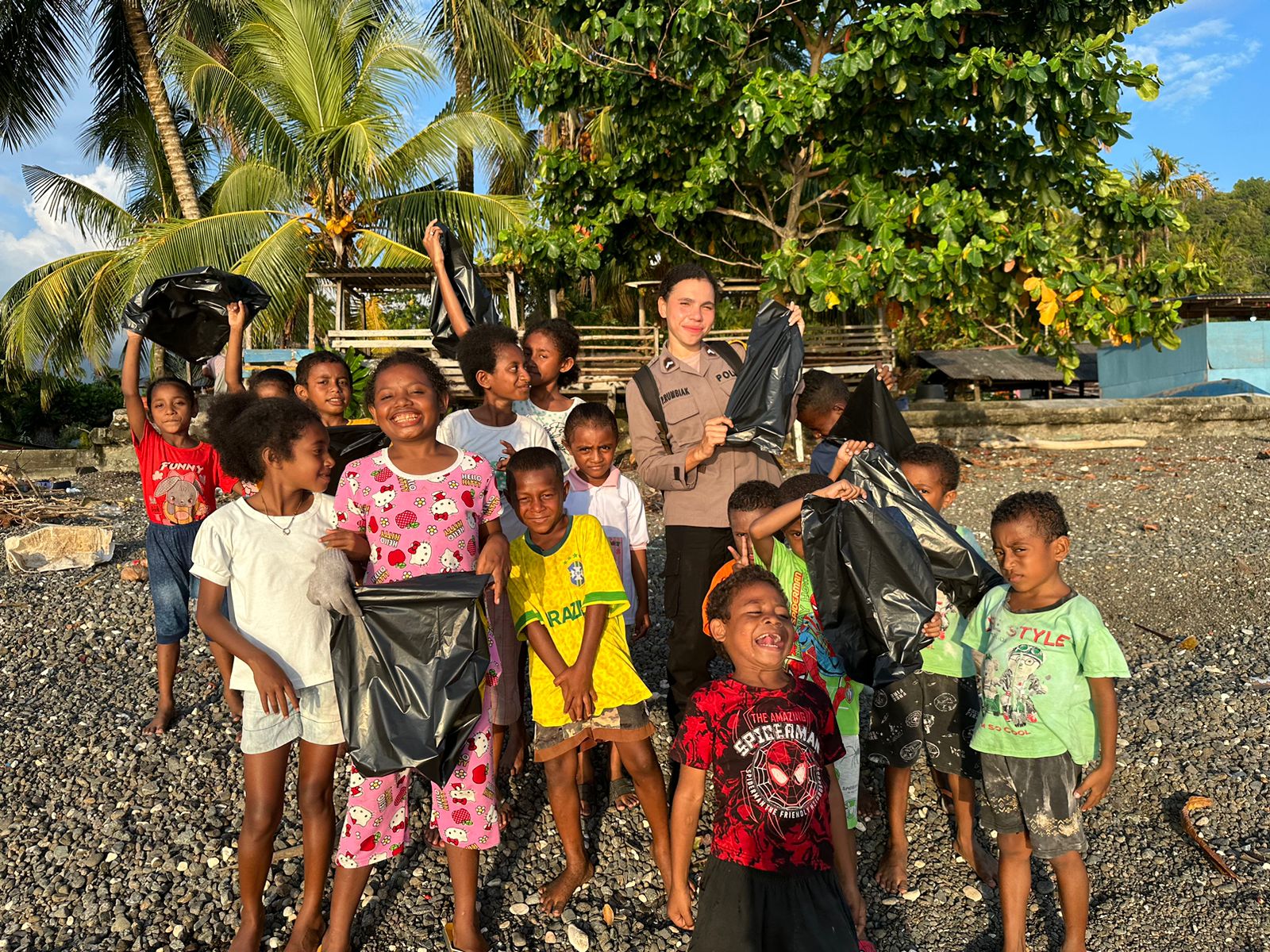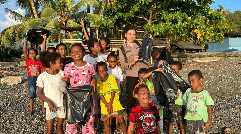Melibatkan anak-anak dalam kegiatan membersihkan sampah sambil bercanda berhasil memperkuat kedekatan antara Srikandi Polri, Bripda Gina G.E Ansanay, dengan anak-anak Papua.