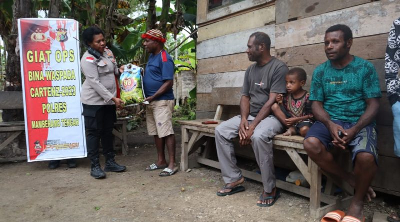 Papua – Dalam Rangka Operasi Bina Waspada Cartenz 2023 Polri Peduli terhadap Masyarakat dengan membagikan sembako Kepada Tokoh Masyarakat Dan Tokoh Pemuda dan Tokoh Agama Selaku Pengendali Kamtibmas Kampung Kobakma 1 Distrik Kobakma Kab.Mamberamo Tengah.