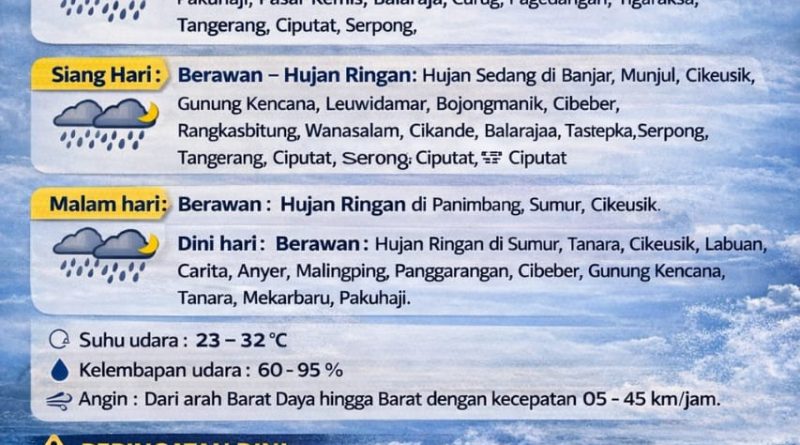 Memasuki siang hari, cuaca diprakirakan berawan hingga hujan ringan, dengan potensi hujan sedang di wilayah Banjar, Munjul, Cikeusik, Gunung Kencana, Leuwidamar, Bojongmanik, Cibeber, Rangkasbitung, Wanasalam, Cikande, Balaraja, Tigaraksa, Curug, Pagedangan, Tangerang, Serpong, dan Ciputat.