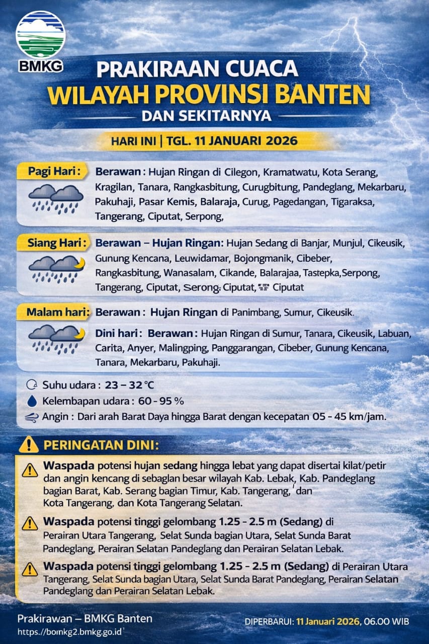 Berdasarkan informasi BMKG, cuaca di wilayah Provinsi Banten dan sekitarnya pada pagi hari diprakirakan berawan, dengan potensi hujan ringan di wilayah Cilegon, Kramatwatu, Kota Serang, Kragilan, Tanara, Rangkasbitung, Curugbitung, Pandeglang, Mekarbaru, Pakuhaji, Pasar Kemis, Balaraja, Curug, Pagedangan, Tigaraksa, Tangerang, Ciputat, dan Serpong.
