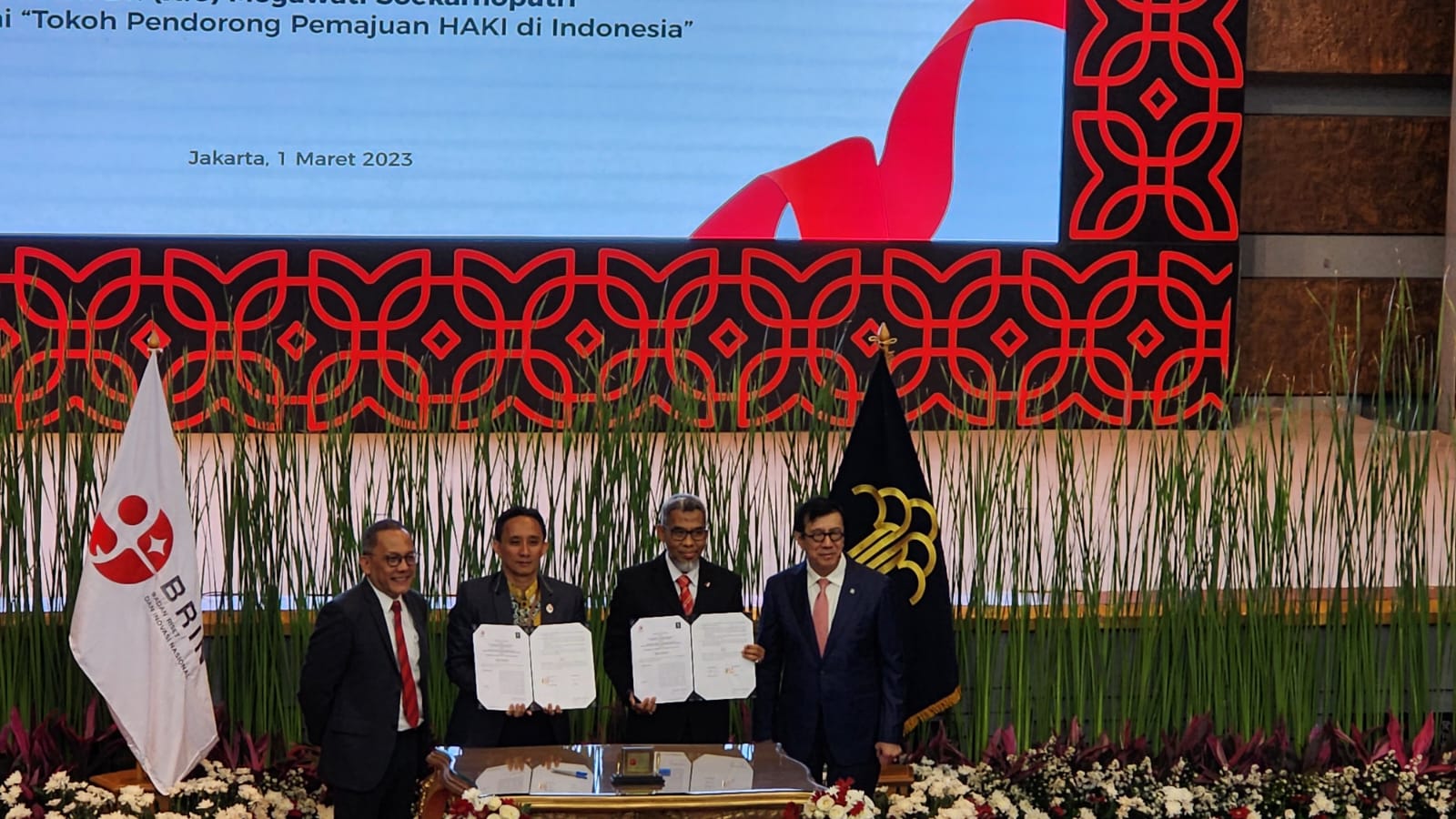 “Komitmen bersama ini akan memantapkan langkah KOLABORAKSI (Kolaborasi antara Kementerian/ Lembaga yang saling BerSinergi) untuk menyatukan langkah bersama dalam mengelola dan memanfaatkan hasil riset dan inovasi nasional yang dihasilkan oleh BRIN untuk dapat memberikan dampak yang signifikan terhadap pertumbuhan ekonomi nasional, terutama potensi di bidang kekayaan intelektual (KI),” ujar Menteri Hukum dan HAM (Menkumham), Yasonna H. Laoly, pada acara Penandatanganan Nota Kesepahaman antara Kemenkumham dan BRIN pada Rabu, 1 Maret 2023 di Kantor BRIN, Jakarta Pusat.