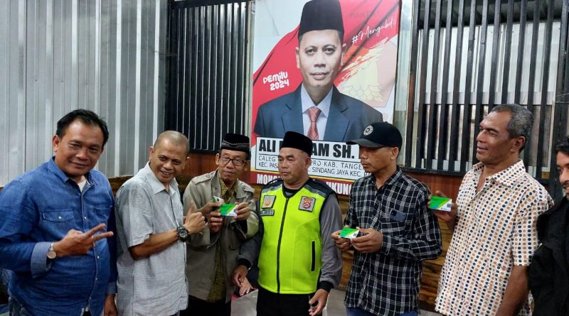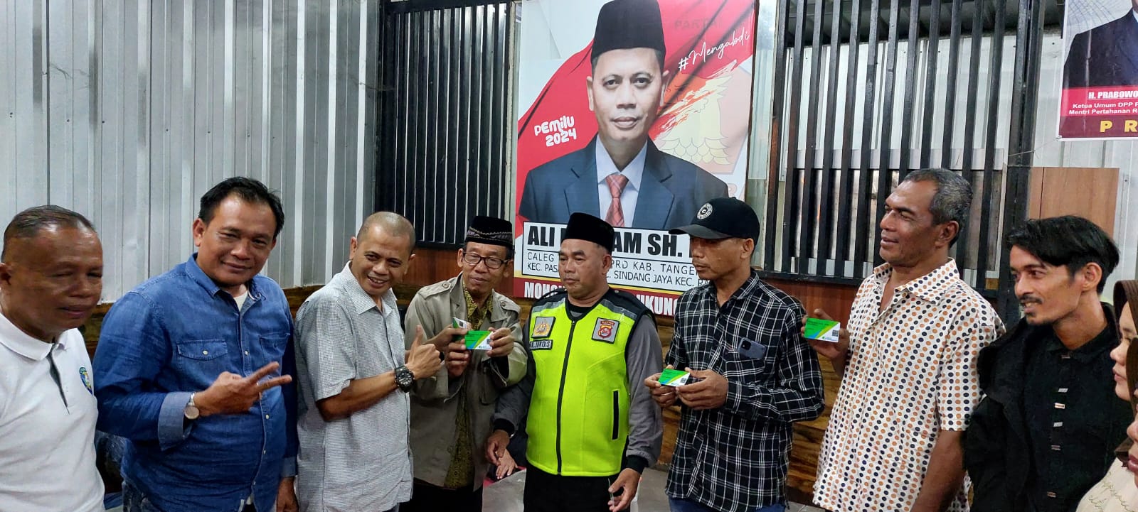 Ali Farham SH. MH Caleg nomor urut 6 dapil IV Kecamatan Pasar Kemis, Rajeg dan Sindang Jaya dari Partai Gerindra kepada wartawan mengatakan, hari ini di bantu tim kemenangan Ali Farham melaunching sebanyak 500 BPJS TK yang dibagikan kepada warga masyarakat.