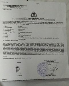 Berdasarkan Laporan Polisi Nomor: LP/B/250/VI/2025/SPKT/POLRES BANYUASIN/POLDA SUMATERA SELATAN tanggal 02 Juni 2025 pukul 11.46 , bertempat di kantor kepolisian tersebut di atas, pada hari, tanggal ditanda tanganinya Surat Tanda Penerimaan Laporan, dengan ini diterangkan bahwa: