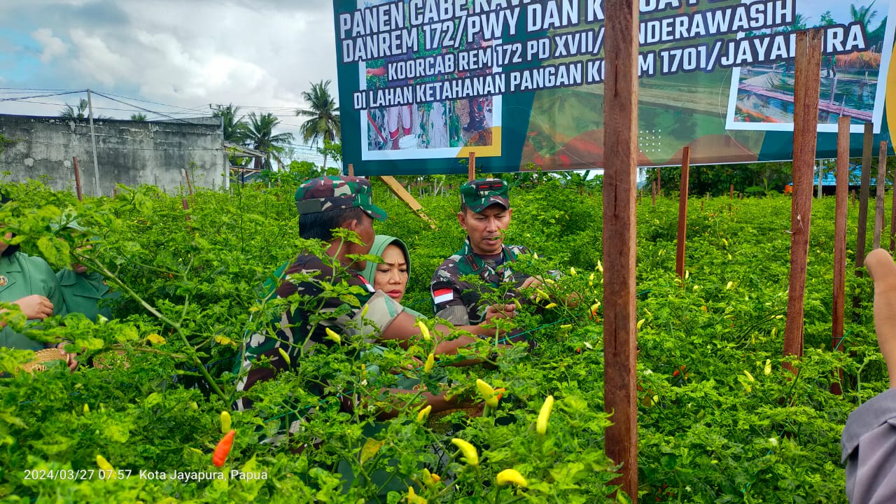 Jayapura – Dalam rangka mewujudkan Ketahanan Pangan, Komandan Korem (Danrem) 172/PWY Brigjen TNI Dedi Hardono yang didampingi Ketua Persit KCK Koorcab Rem 172, memimpin Panen Raya Cabai Rawit dan Ikan Mujair di Lahan Ketahanan Pangan Kodim 1701/Jayapura, bertempat di Distrik Koya Timur, Kota Jayapura, pada Rabu (27/3).
