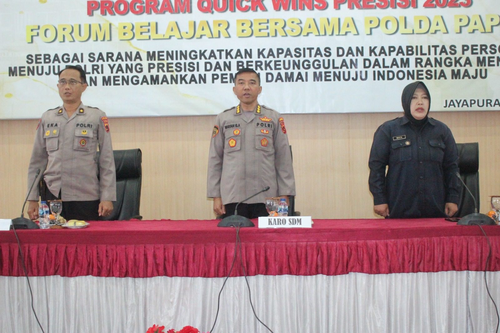 Papua – Biro Sumber Daya Manusia (SDM) Polda Papua menggelar Forum Belajar Bersama sebagai bagian dari Program Quick Wins Presisi 2023, Kamis (23/11/2023). Kegiatan yang dilaksanakan di Aula Rastra Samara Polda Papua Lama pada ini bertujuan untuk meningkatkan kapasitas dan kapabilitas personel, menjadikan Polri yang presisi dan unggul dalam mengawal serta mengamankan pemilu damai menuju Indonesia Maju.