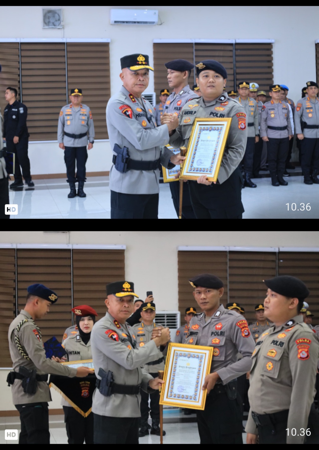 Diakhir kegiatan, Kapolda Banten Irjen Pol. Hengki memberikan penghargaan kepada dua personel Ditpamobvit Polda Banten yang berhasil meringkus pelaku penyelundup narkoba jenis sabu seberat kurang lebih 5 kilogram melalui jalur pengamanan X-ray di Pelabuhan Bakauheni, Lampung pada tahun 2025. ( Red / Bidhumas).