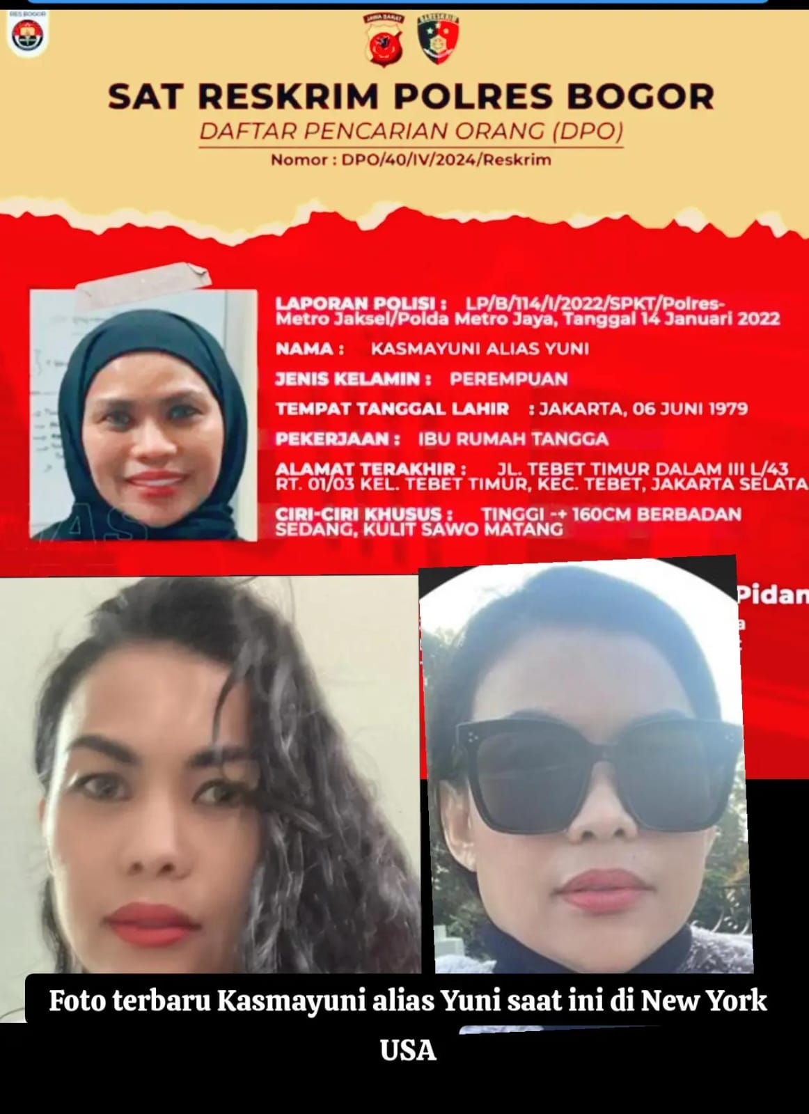 BOGOR |wartaindonesiaterkini.com — Berbagai desakan timbul dari Pengamat juga IAF (Indonesian American Forum) serta netizen agar Polres Bogor untuk segera mengejar dan menangkap tersangka yang kini telah berstatus DPO. ‘Kasmayuni’ alias Yuni usia 46 tahun kini berstatus DPO setelah dijadikan tersangka. Namun Yuni diduga hendak mengaburkan Identitas nya di Amerika Serikat. Informasi tersebut didapatkan oleh Wartawan dari orang terdekat tersangka berinisial RS yang saat ini juga tengah berada di New York USA.
