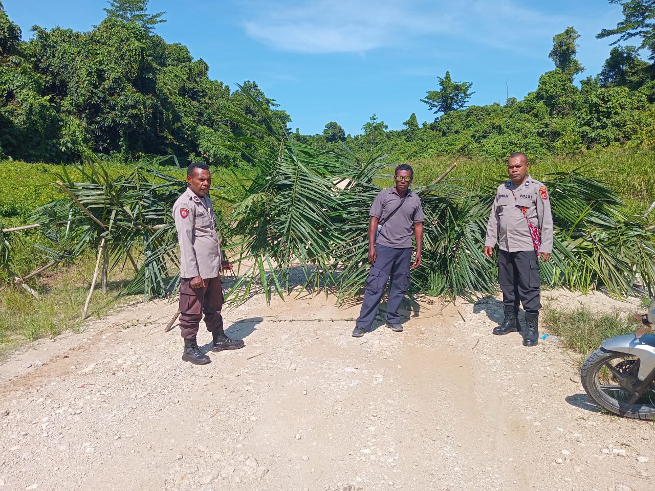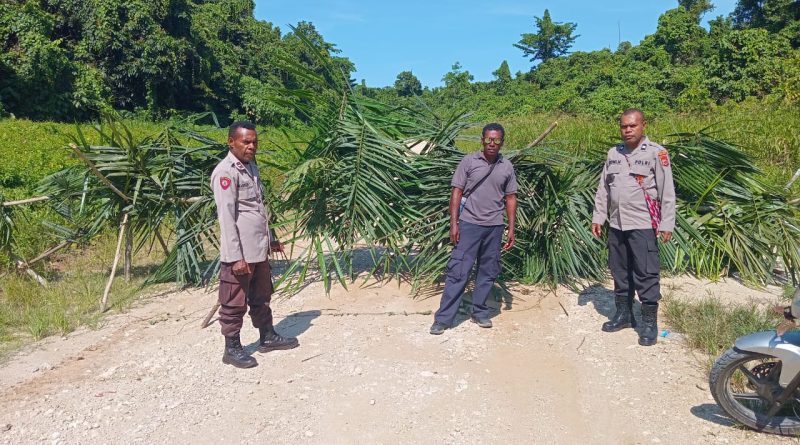 Sarmi – Kapolsek Bonggo bersama anggotnya merespon Informasi dari Wakapolres Sarmi Kompol Aser Borom melalui Via telepon bahwa telah dilakukan Pemalangan di Pertigaan Jl.Logpounp Mudu Km 1 PT.Wapoga Mutiara Timber dan Salaki oleh Pemilik Hak Ulayat Asal Kampung Taronta Distrik Bonggo, Kabupaten Sarmi, Selasa (8/10/2024)