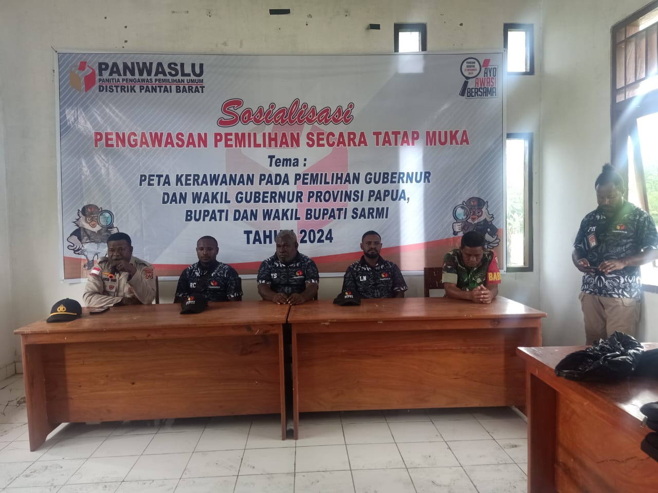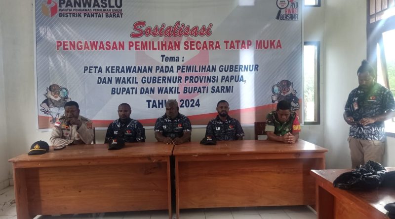 Sarmi – Kapolsek Pantai Barat Ipda Adolf Awor Yane menghadiri giat Sosialisasi Pengawasan Pemilihan Secara Tatap Muka dengan tema “Peta Kerawanan pada Pemilihan Gubernur dan wakil Gubernur Provinsi Papua, Bupati dan Wakil Bupati Sarmi tahun 2024, yang dilaksanakan di aula Distrik Pantai Barat, Kamis (24/10/2024)