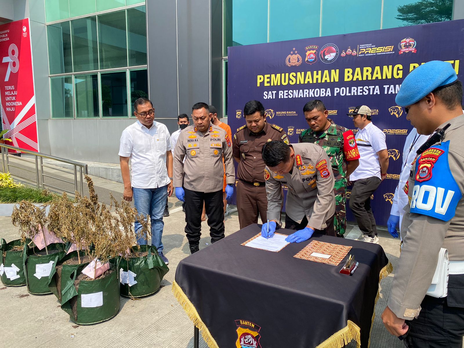 Kombes Pol Sigit Dany Setiyono, S.H, S.IK, M.Sc.Eng Kapolresta Tangerang menyampaikan, delapan batang pohon narkotika golongan I dalam bentuk tanaman jenis ganja yang masing-masing batang pohon ditanam di Pot karung terpal Planter dan 1 buah toples plastik kotak bening berisi daun ganja yang sudah kering dengan berat brutto 67.0 gram tidak dilakukan pemusnahan dikarenakan dilakukan penyisihan untuk kepentingan persidangan di Pengadilan Negeri Tangerang.