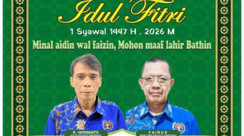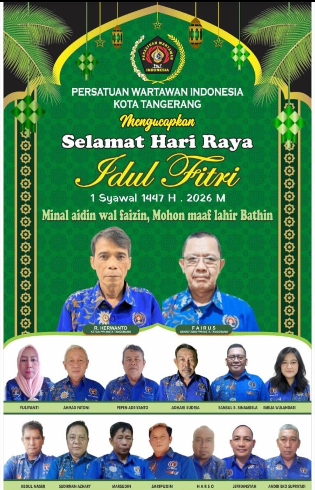 KOTA TANGERANG|WIT – Ketua Persatuan Wartawan Indonesia (PWI) Kota Tangerang Herwanto yang akrab dipanggil Wanto bersama segenap pengurus dan anggota mengucapkan: “Selamat Hari Raya Idul Fitri 1447 H ” Mohon maaf lahir dan bathin”, Semoga kemenangan dan keberkahan selalu menyertai kita semua, Jum’at (20/03/2026).