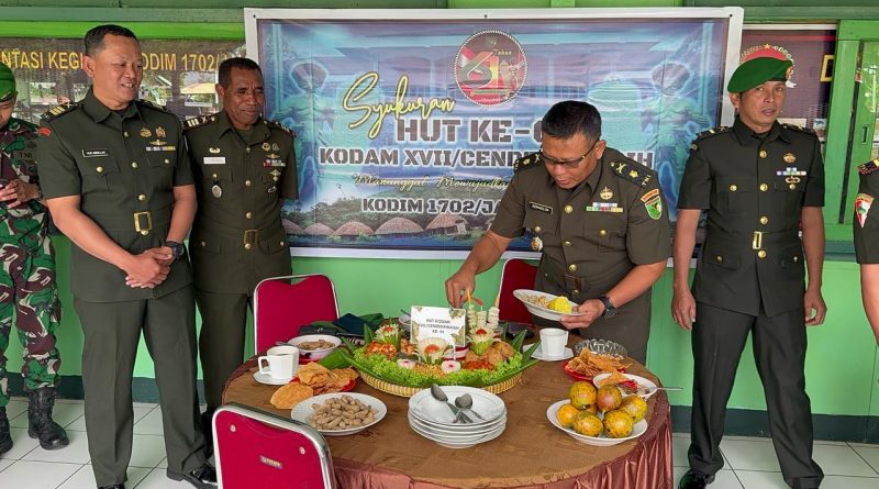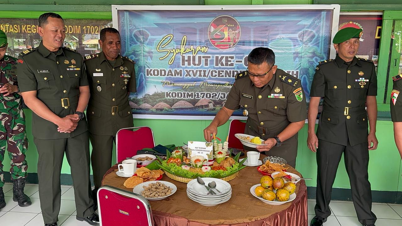 Wamena – Kodim 1702/Jayawijaya gelar syukuran potong tumpeng memperingati HUT Ke-61 Kodam XVII/Cenderawasih, bertempat di Makodim 1702/Jayawijaya Jln. Yos Sudarso, Distrik Wamena, Kabupaten Jayawijaya, Provinsi Papua Pegunungan, Jumat (17/05/2024).