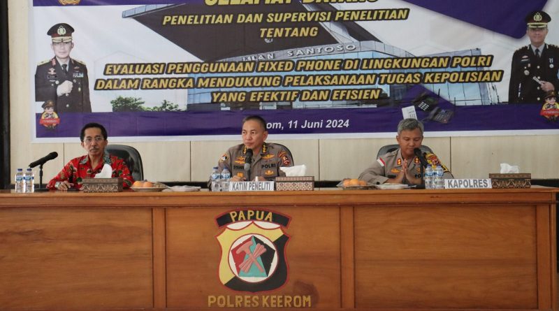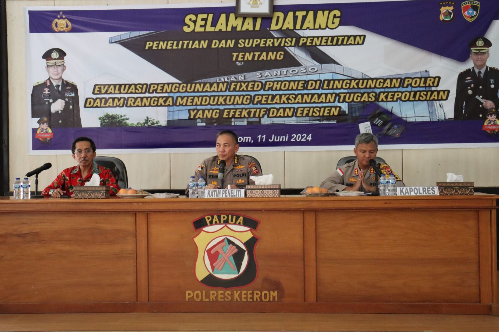 Papua – Tim Puslitbang Mabes Polri kunjungi Polres Keerom untuk melaksanakan penelitian dan supervisi, tentang evaluasi penggunaan Fixed Phone di lingkungan Polri dalam rangka mendukung pelaksanaan tugas Kepolisian yang efektif dan efisien yang dilaksanakan di Aula Wira Pratama Polres Keerom,(11/6/2024).