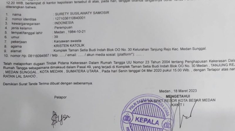 Selain itu, Surety juga membeberkan sejumlah bukti KDRT, yang saat ini tengah ditangani Polda Sumut namun masih proses pemanggilan ke 2 (dua) dan laporan itu juga sudah hampir setahun umur nya, namun pihak penyidik Poldasu juga masih belum menemukan tersangka nya, meski jelas jelas terlapor nya ‘Ratan Lal Sahoo’ [WNA] dan orang yang sama pada laporan penelantaran anak di Polrestabes Medan.