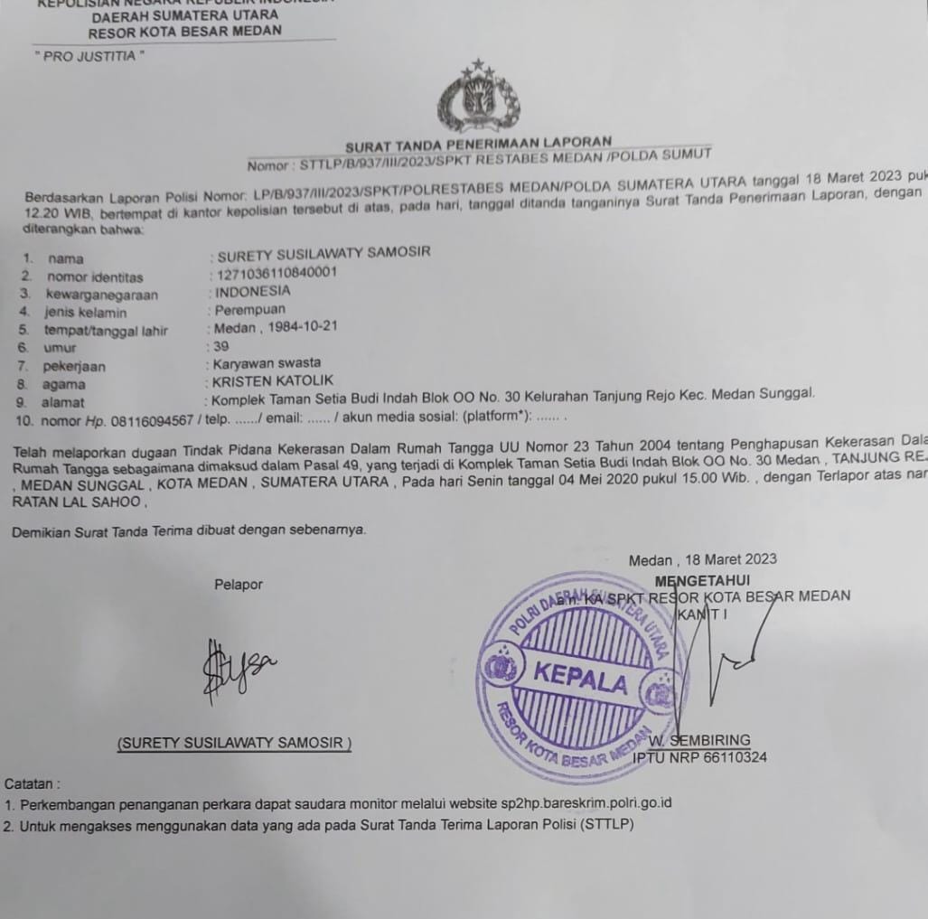 Selain itu, Surety juga membeberkan sejumlah bukti KDRT, yang saat ini tengah ditangani Polda Sumut namun masih proses pemanggilan ke 2 (dua) dan laporan itu juga sudah hampir setahun umur nya, namun pihak penyidik Poldasu juga masih belum menemukan tersangka nya, meski jelas jelas terlapor nya ‘Ratan Lal Sahoo’ [WNA] dan orang yang sama pada laporan penelantaran anak di Polrestabes Medan.