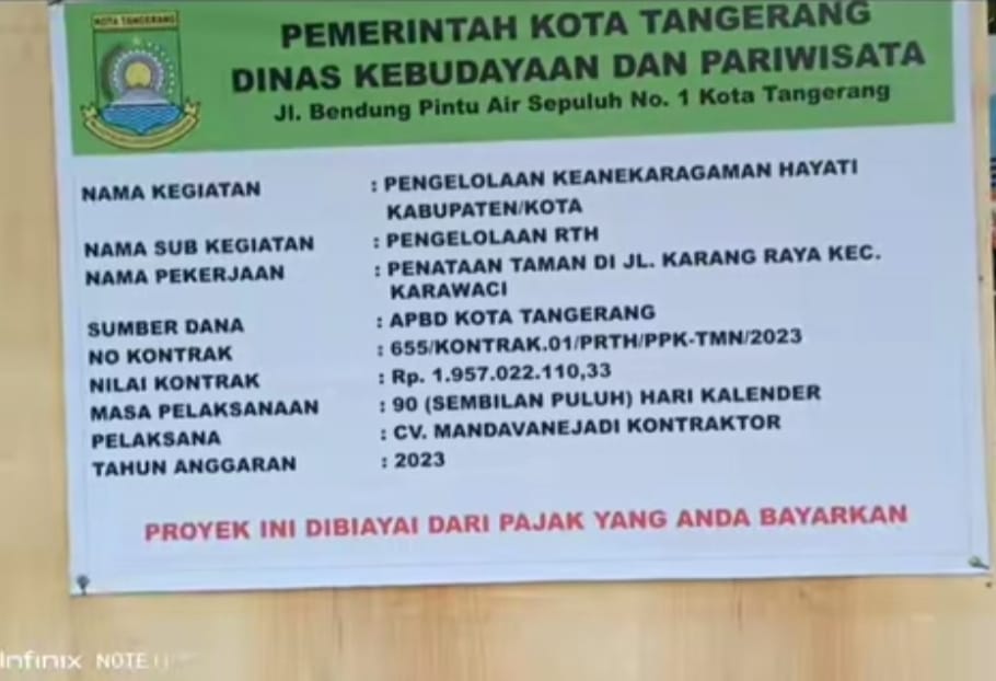 CV. MANDAVANE JADI KONTRAKTOR, mengerjakan proyek senilai Rp 1,9 miliar itu, yang tujuannya penegelolaan RTH [Ruang Terbuka Hijau] pendanaan nya bersumber dari APBD Kota Tangerang TA. 2023 dengan masa pengerjaan selama 90 hari kelender yang dimulai sejak tanggal 29 september 2023.