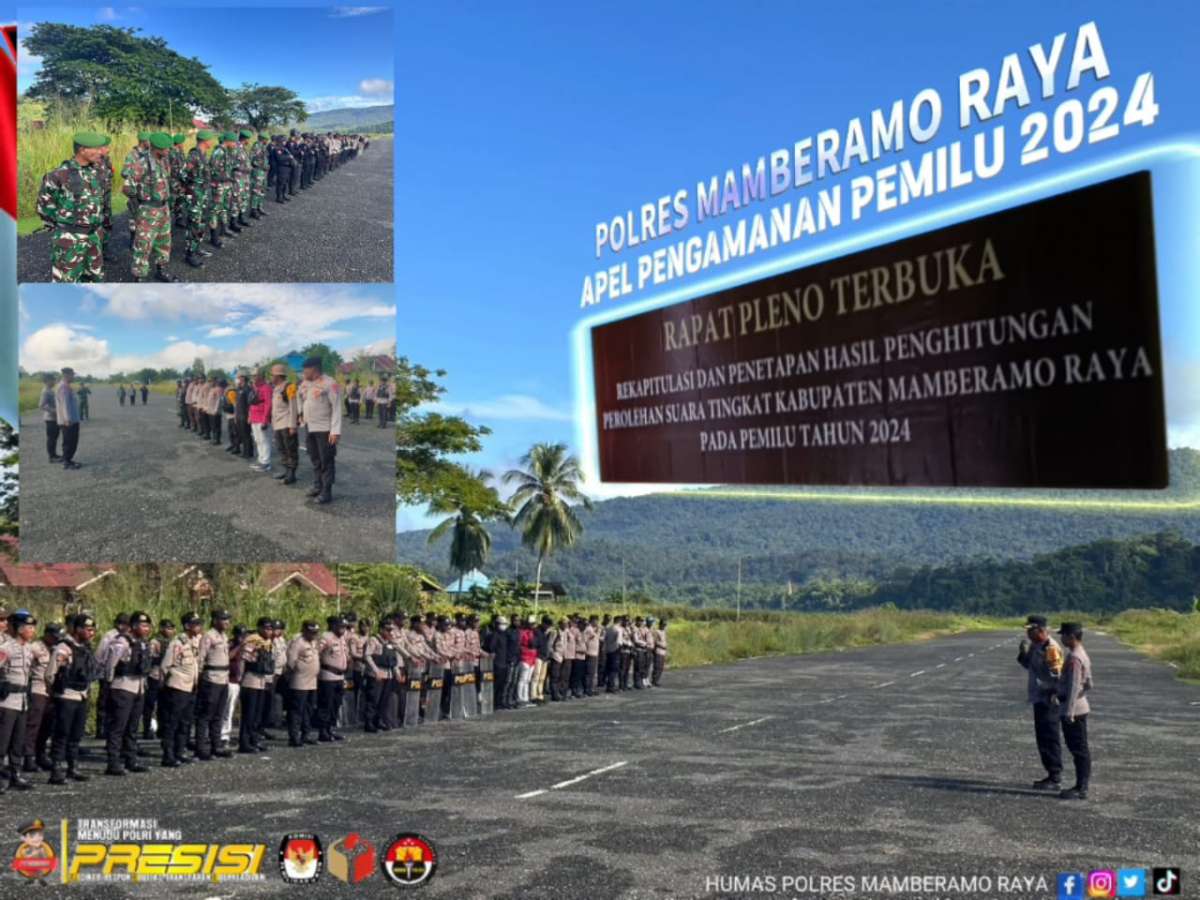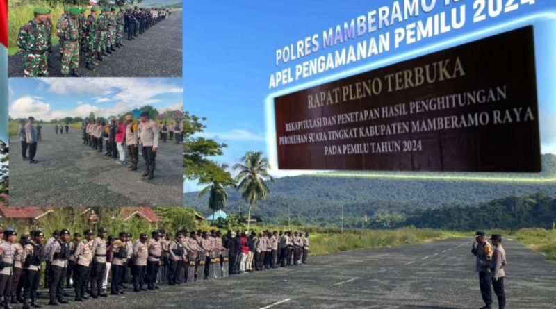 Papua – Pelaksanaan apel Gabungan dalam rangka Pelaksanaan Pemilu 2024 yang sudah masuk pada tahapan Rapat Pleno Rekapitulasi Perhitungan Suara Tingkat Kabupaten Mamberamo Raya, jumat (01/03/2024).