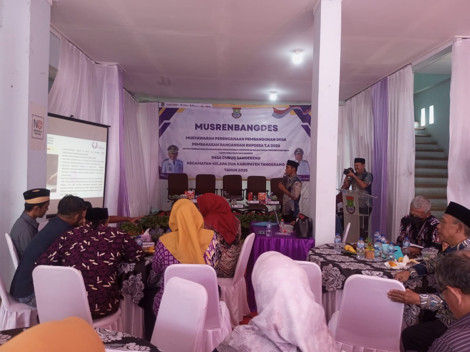Tangerang|wartaindonesiaterkini.com– Pemerintah Desa Curugsangereng, Kecamatan Kelapa Dua, Kabupaten Tangerang, Banten. Melaksanakan Musyawarah Perencanaan Pembangunan Desa (Musrenbangdes) pembahasan rencangan RKP Desa Tahun 2026, bertajuk untuk pemerataan pembangunan berwawasan lingkungan dalam upaya peningkatan daya saing desa maju dan mandiri. Kamis, (23/10/2025).