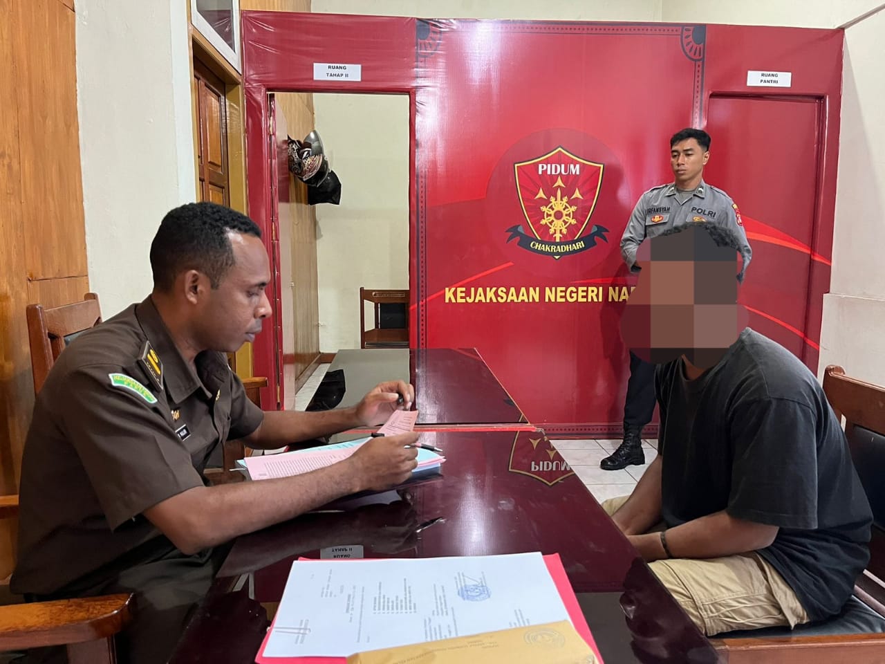 Proses penyerahan tersangka dan barang bukti dilakukan oleh Ps. Kanit Idik Aipda Frits Tonci Wakum bersama anggota di kantor Kejaksaan Negeri Nabire.