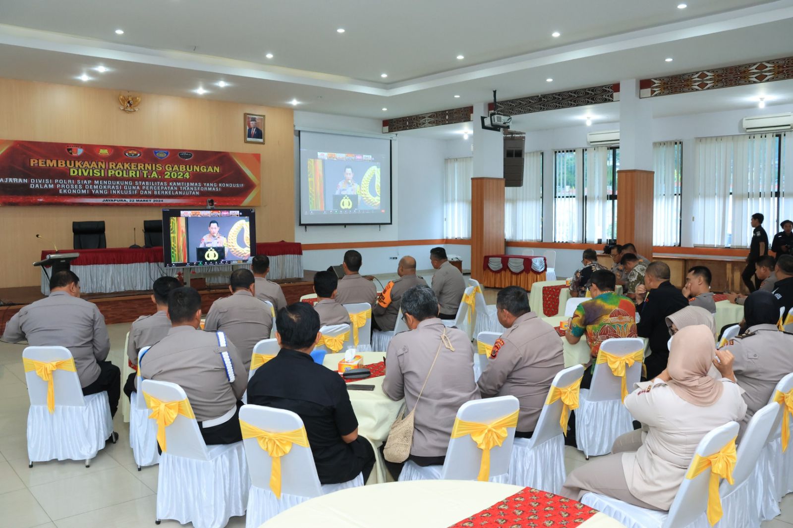 Papua – Kepala Kepolisian Daerah (Kapolda) Papua, Irjen Pol Mathius D. Fakhiri, S.I.K., mengikuti secara virtual Kegiatan Pembukaan Rapat Kerja Bersama (Rakernis) Gabungan Divisi Polri Tahun Anggaran 2024, yang diselenggarakan di Aula Rastra Samara Polda Papua, (22/03).