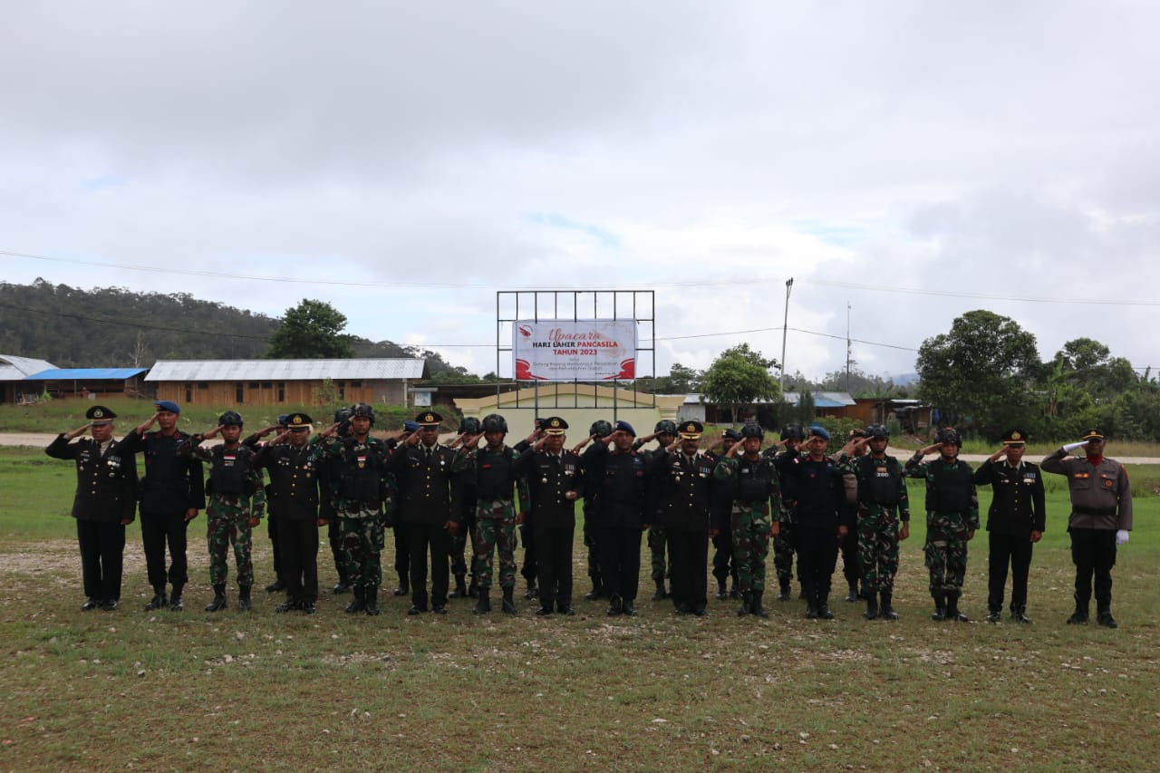Mamberamo Tengah, WIT – Kapolres Mamberamo Tengah Kompol SUDIRMAN bersama para pejabat utama Personel Brimob dan TNI mengikuti kegiatan upacara peringatan hari lahir Pancasila tahun 2023 di Lapangan Apel Mapolres Mamteng. Kamis (01/06/2023)