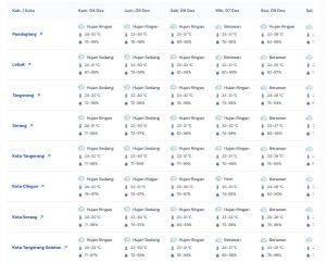 “BMKG telah memperbarui prakiraan cuaca untuk wilayah Provinsi Banten. Pagi hari diprakirakan didominasi cuaca berawan, dengan hujan ringan di sejumlah kecamatan seperti Cilegon, Pulomerak, Kramatwatu, Bojonegara, Ciomas, Padarincang, serta beberapa wilayah di Pandeglang, Lebak, dan Tangerang. Memasuki siang hari, potensi hujan meningkat dengan adanya hujan lebat di wilayah seperti Jiput, Mandalawangi, Kaduhejo, Pandeglang, hingga Carita. Sementara itu, hujan sedang diprediksi terjadi di sebagian besar Kabupaten Serang, Kota Serang, Cilegon, serta wilayah Tangerang Raya,” jelas Meryadi.