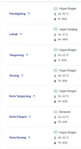 BMKG memprakirakan sebagian besar wilayah Provinsi Banten berpotensi mengalami cuaca berawan hingga hujan dengan intensitas ringan hingga sedang, serta potensi hujan sedang hingga lebat yang disertai kilat atau petir dan angin kencang di sejumlah wilayah.