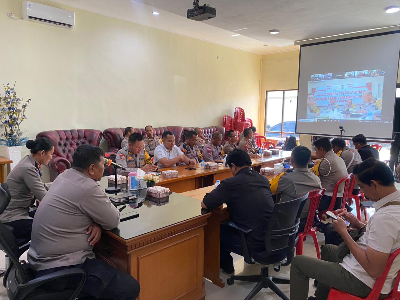 Papua – Satgas Ops Wil Papua Selatan bersama Satgas Ops Res mengikuti Rapat Analisa dan Evaluasi (Anev) Mingguan yang dipimpin Karendal Ops Operasi Mantap Praja Cartenz (OMPC) II 2024 Kombes Pol I Ketut G. Wijatmika, S.I.K.