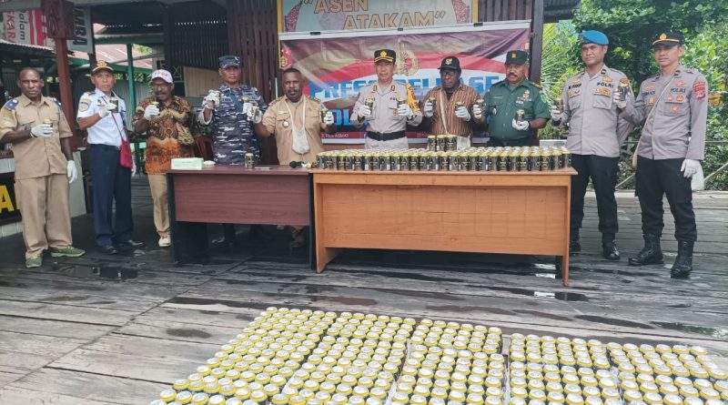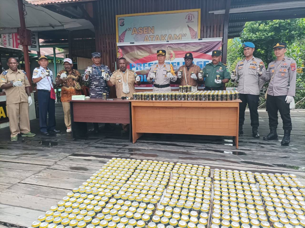 “Kami bersama-sama dengan bapak Kepala Distrik Agats, Pabung Kodim 1707 Merauke, dan Danpos AL, hari ini akan melakukan pemusnahan 1.200 kaleng minuman keras jenis Guinness yang diamankan dari hasil razia pengawasan pengiriman barang di konter,” ujar Kapolres Asmat.