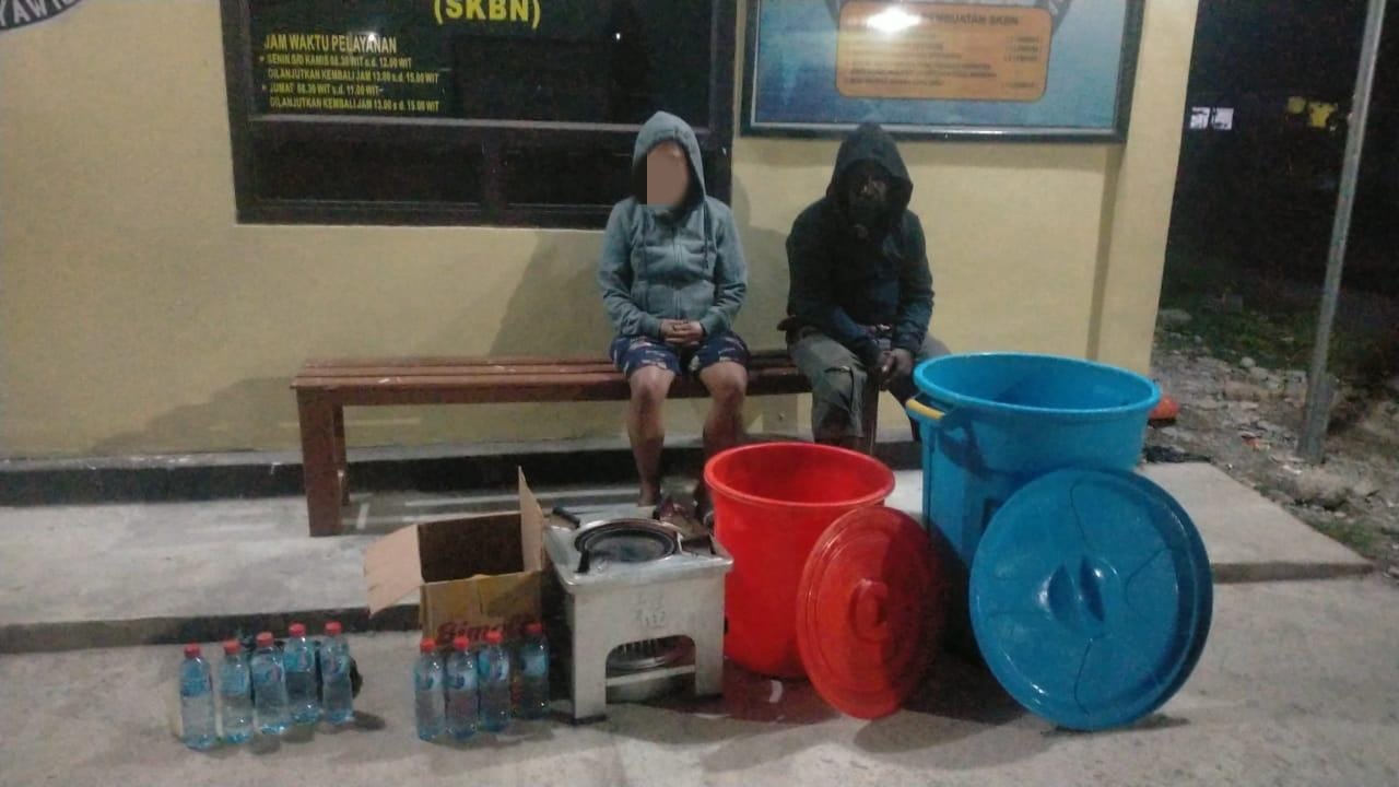 Pelaku diamankan bersama barang bukti berupa minuman keras lokal jenis CT (Cap Tikus) berjumlah 9 botol dan 2 Ember berisi Balo dan 1 Kompor ynag digunakan untuk membuat Miras.