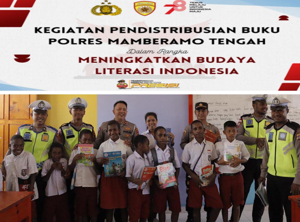 Polri Peduli Literasi di Indonesia Malalui Pembagian Buku kepada Sekolah SD Negeri Kobakma Kabupaten Mamberamo Tengah