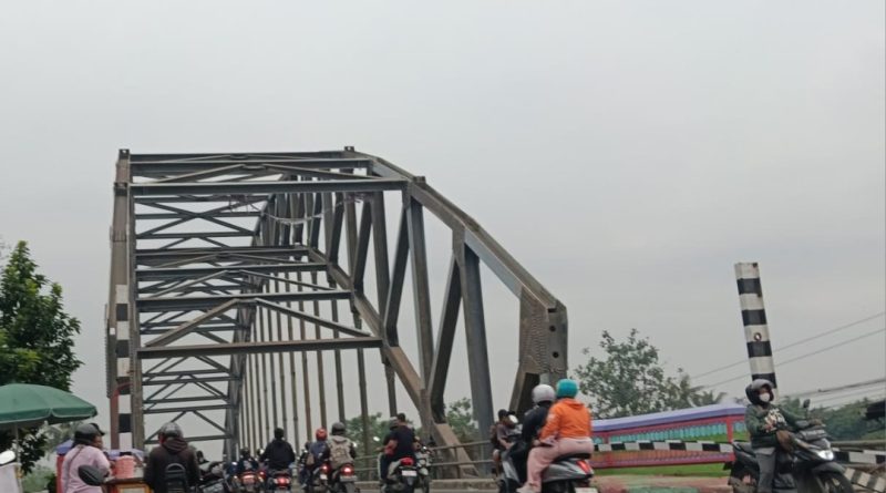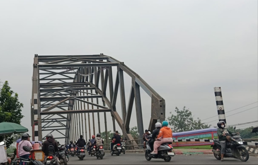 Pantauan di lokasi sekitar pukul 07.28 WIB, arus kendaraan roda dua tampak padat dari kedua arah. Sejumlah pengendara terpaksa memperlambat laju kendaraan akibat lalu lintas yang semrawut, terutama di tikungan jalan sempit yang berbatasan langsung dengan jembatan rangka besi tersebut.