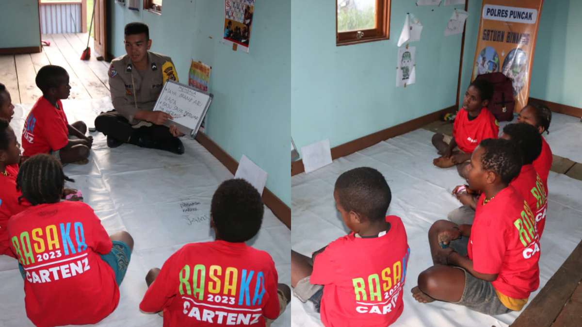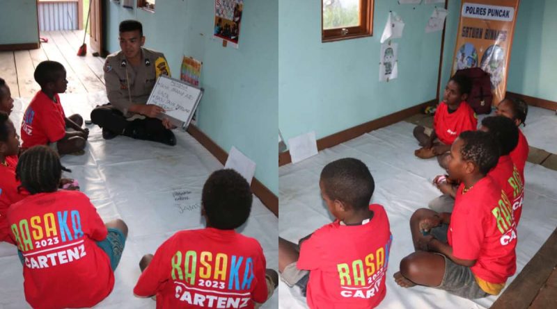 Papua – Personil Satgas Binmas Ops Rasaka Cartenz yang dipimpin oleh Kasubsatgas Binmas Wilayah Puncak Iptu Yonias Purwanto melaksanakan program Polisi Pi Ajar (Si Ipar) di Kampung Kago Kabupaten Puncak, Jumat (24/11).