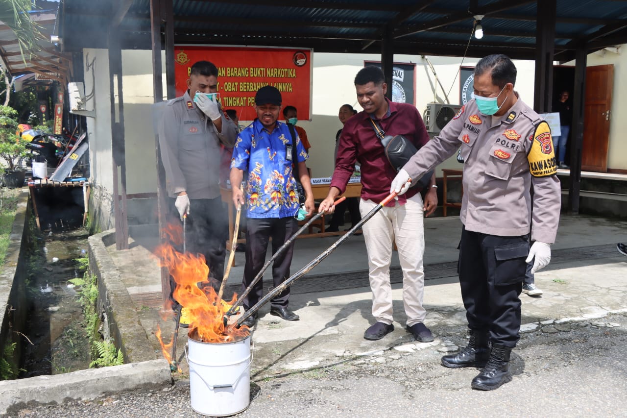 Pemusnahan barang bukti dilakukan dengan metode yang aman. Ganja dimusnahkan dengan cara dibakar dalam wadah pembakaran, sementara sabu dilarutkan dalam air menggunakan blender sebelum akhirnya dibuang.