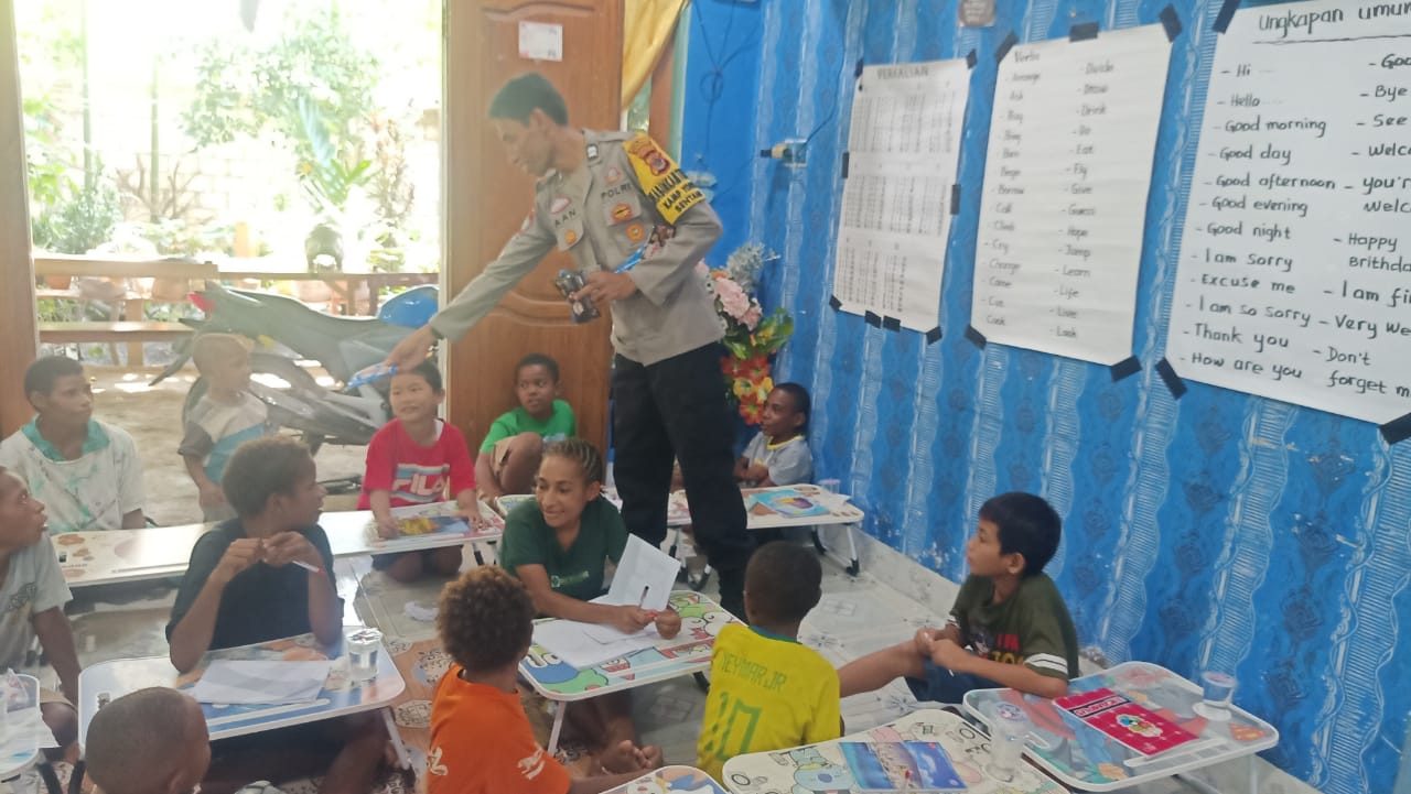 Kapolres Jayapura AKBP Fredrickus Maclarimboen, S.I.K., M.H., melalui Kapolsek Kawasan Bandara Sentani Iptu Wajedi, S.H., M.Si., menyampaikan bahwa Bhabinkamtibmas terus konsisten mengajarkan anak-anak peserta didik.