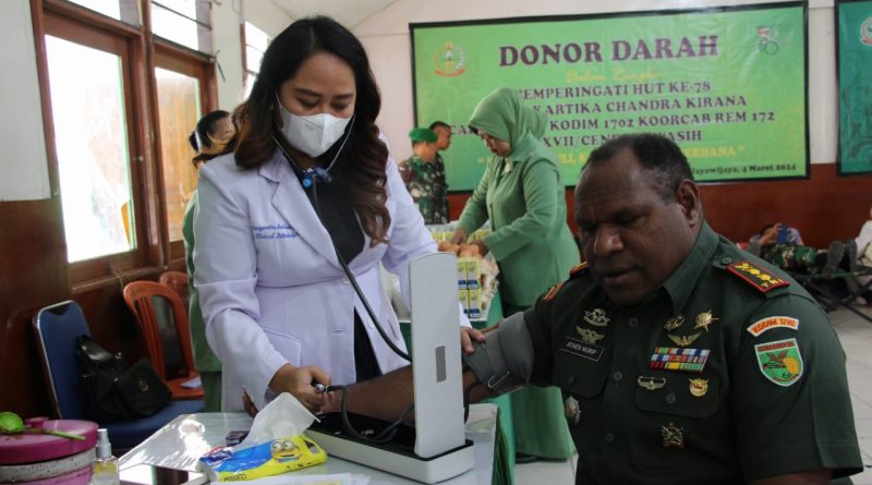 Wamena – Dalam rangka memperingati HUT Persatuan Istri Tentara (Persit) Kartika Chandra Kirana Ke-78 Tahun 2024, Kodim 1702/Jayawijaya gelar kegiatan bakti sosial donor darah, bertempat di Aula Makodim 1702/Jayawijaya Jln. Yos Sudarso, Distrik Wamena, Kabupaten Jayawijaya, Provinsi Papua Pegunungan, Senin (04/03/2024).