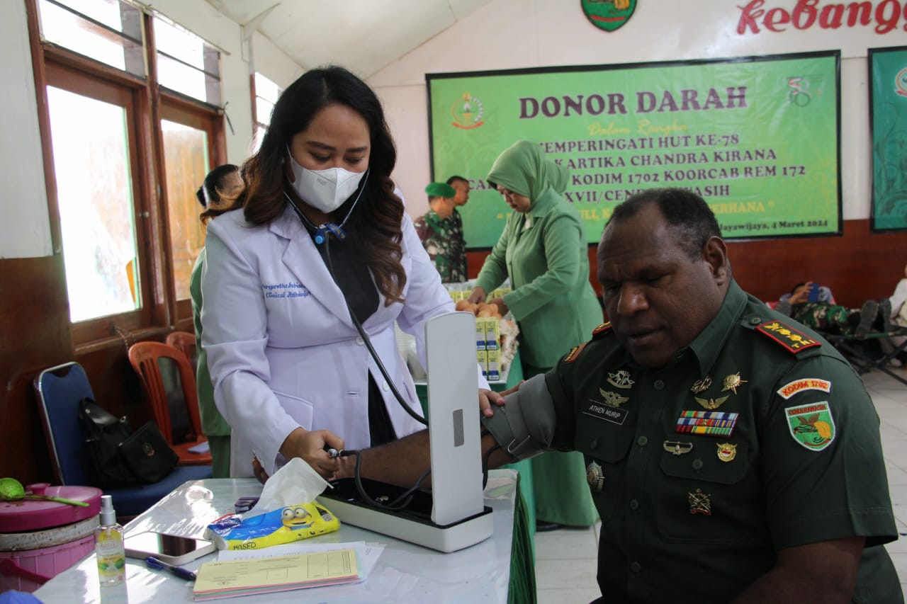 Kegiatan donor darah ini diselenggarakan oleh Kodim 1702/JWY bekerjasama dengan Rumah Sakit Umum Wamena dan diikuti oleh prajurit berserta persit Kodim 1702/JWY, Kodim 1712/Lanny Jaya, Kodim 17016/Tolikara dan Yonif 756/WMS.