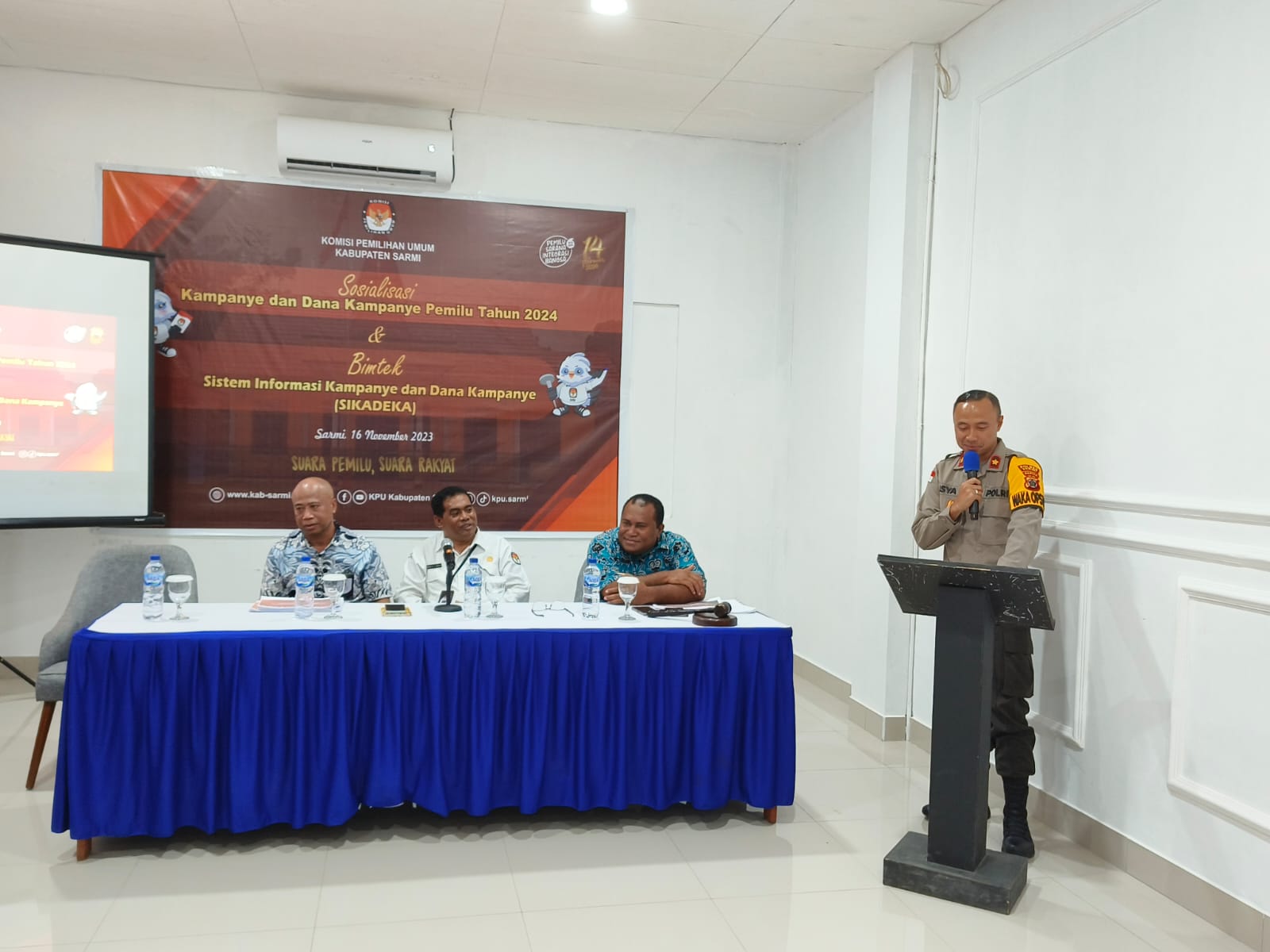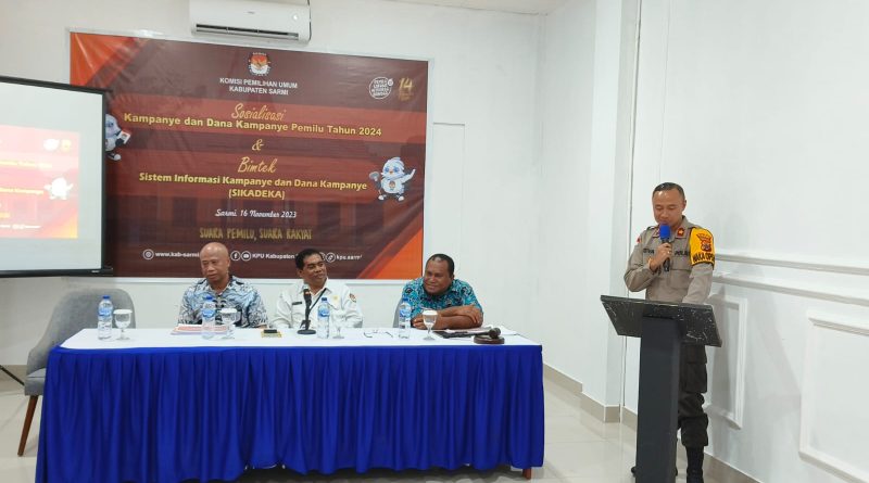 Papua – Kamis,16/11/2023 pukul 09.23 WIT, bertempat di alua hotel Twelve Distrik Sarmi Kabupaten Sarmi telah dilaksanakan kegiatan Sosialisasi Kampanye dan Dana Kampanye pemilu tahun 2024 dan Bimtek Sistem Informasi Kampanye dan Dana Kampanye (SIKADEKA).