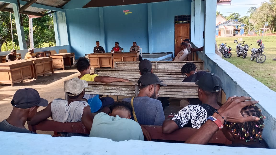 Sarmi – Ka Spk Regi III Aipda Samuel Miosido bersama anggota Polsek Bonggo melakukan Mediasi dengan para pekerja Pembersihan Jembatan di wilayah Kampung Tarwasih marenggi s/d kampung Gwin jaya Dist Bonggo Timur Kab. Sarmi Terkait Aksi Palang Jembatan Poros Kampung Tarwasih Marenggi pada hari Jumat gl 6 September 2024 (kemarin), bertempat di Balai Kampung Tarawesih Marenggi siang tadi.Sabtu (7/9/2024)
