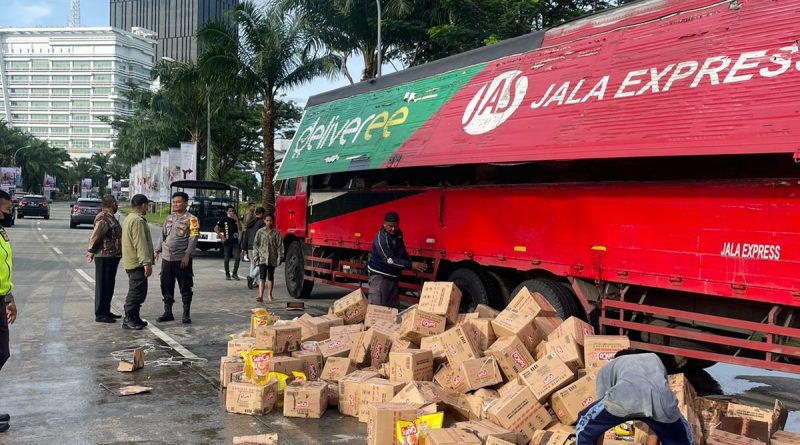 KOTA TANGERANG | WIT – Truk bermuatan minyak goreng bermerk sunco tumpah berserakan di Jalan Jalur sutera Kelurahan Kunciran Kecamatan Pinang, Kota Tangerang Banten, Jum’at (18/11/2022).