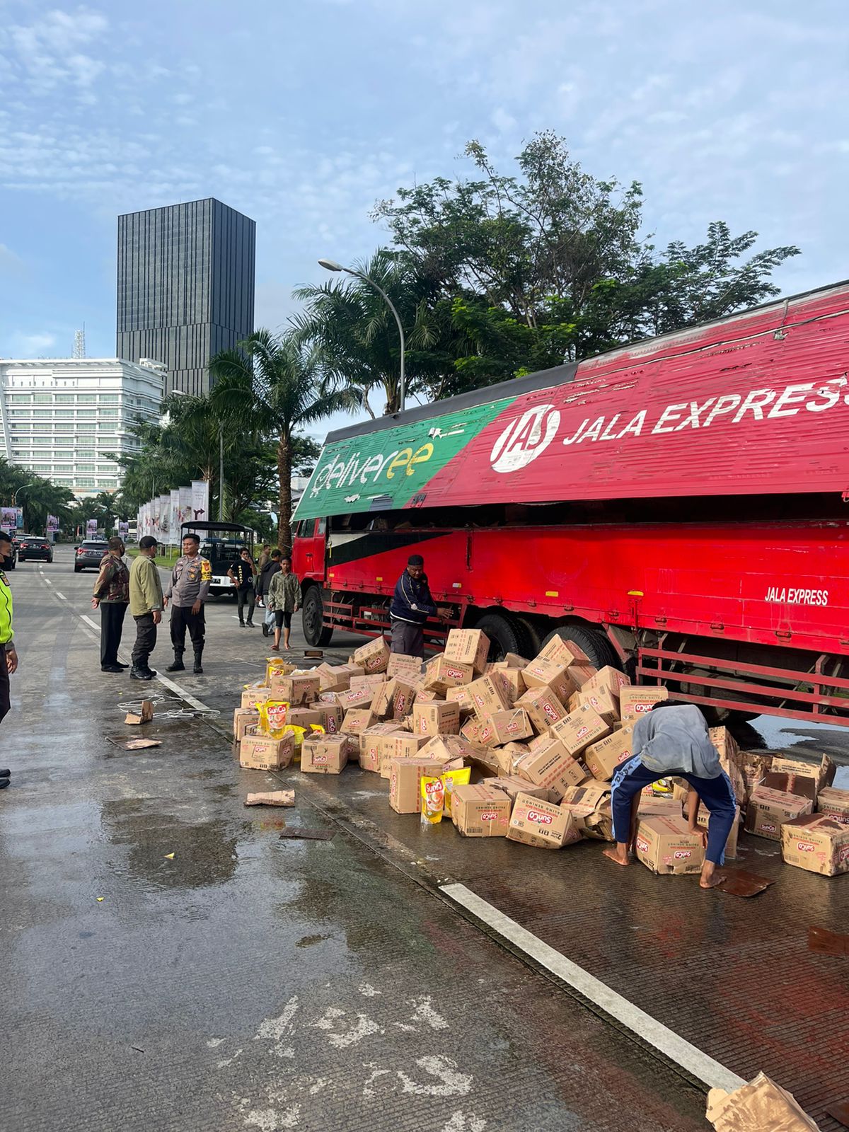 Petugas kepolisian yang datang ke lokasi dibantu sejumlah security setempat bahu-membahu memindahkan Karton karton berisikan minyak goreng tersebut ke tempat yang lebih aman dan membersihkan sekitar area jalan dari tumpahan minyak.